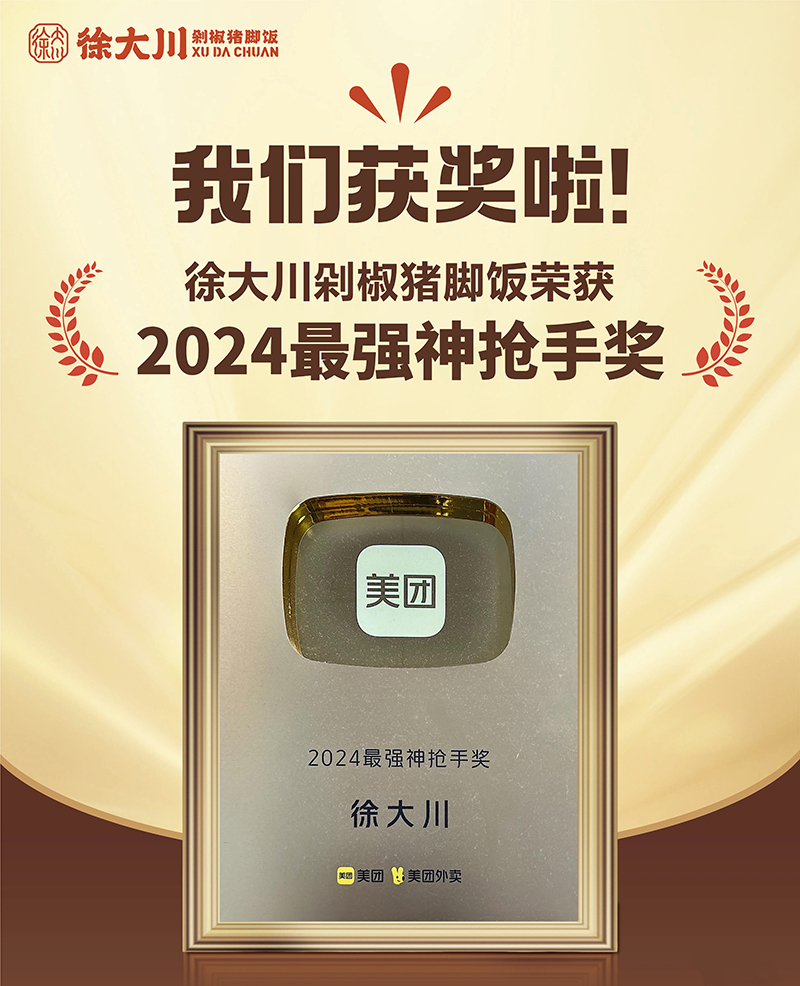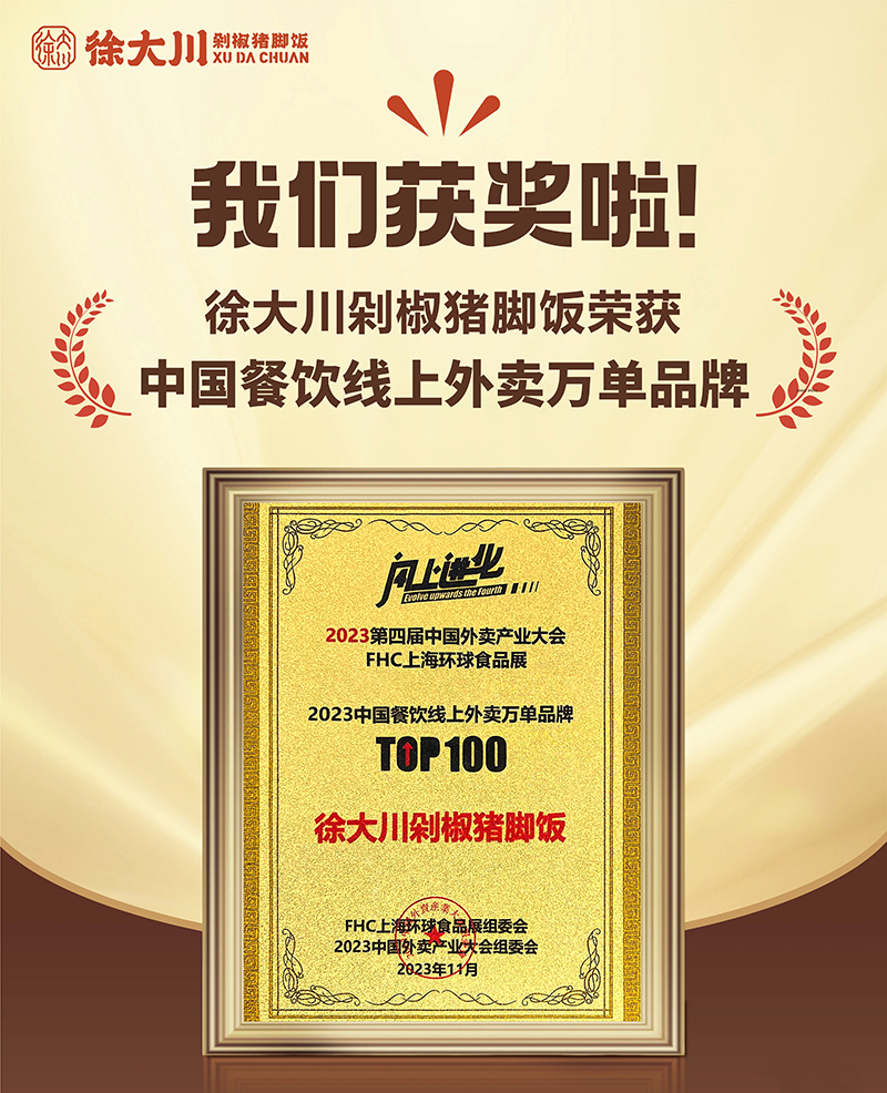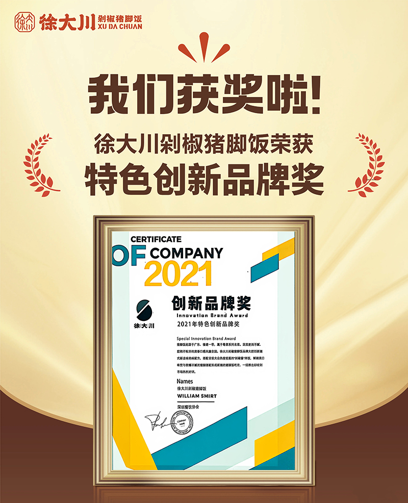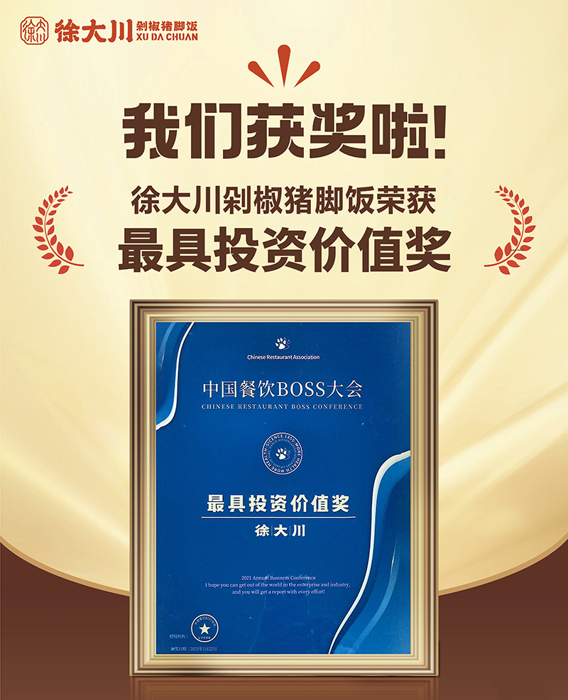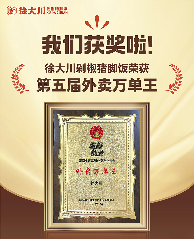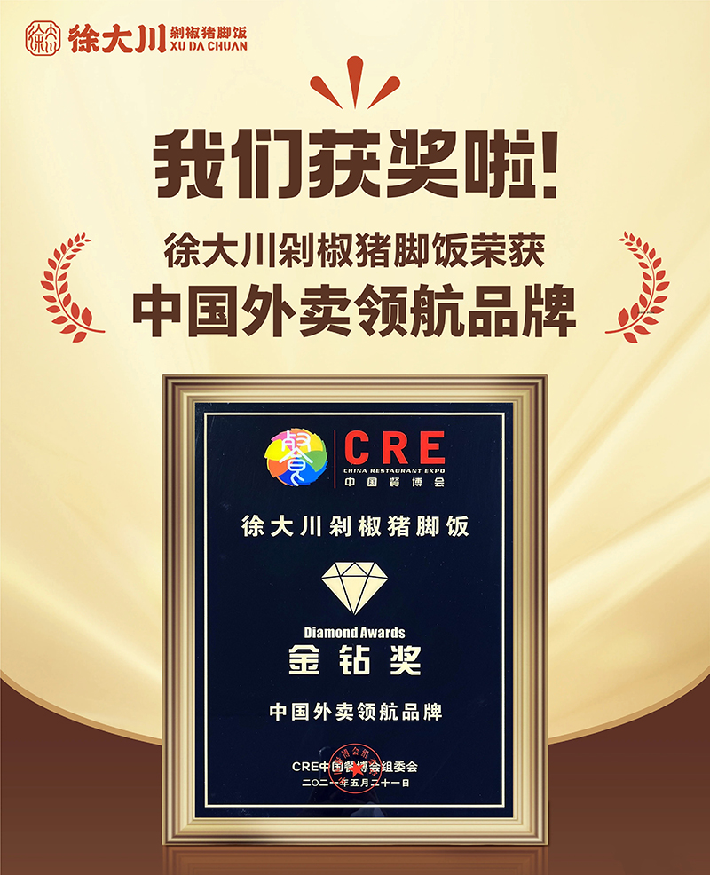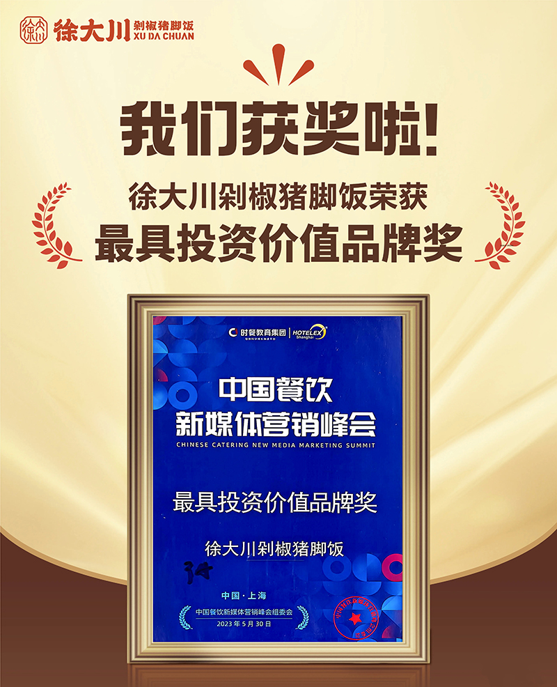公司推出徐大川剁椒猪脚饭品牌后,得到了市场认可,好评如潮。该项目荣获中国餐博会外卖品牌领航金奖、最具影响力奖、最具投资价值奖、新锐优质品牌、2022年度餐饮界创新品牌榜、美团外卖优质商家、中国企业联合发展推广中心优秀项目奖、2023数字供应链金融品牌峰会潜力合作品牌、2023中国餐饮新媒体营销峰会最具投资价值品牌奖等多个奖项。