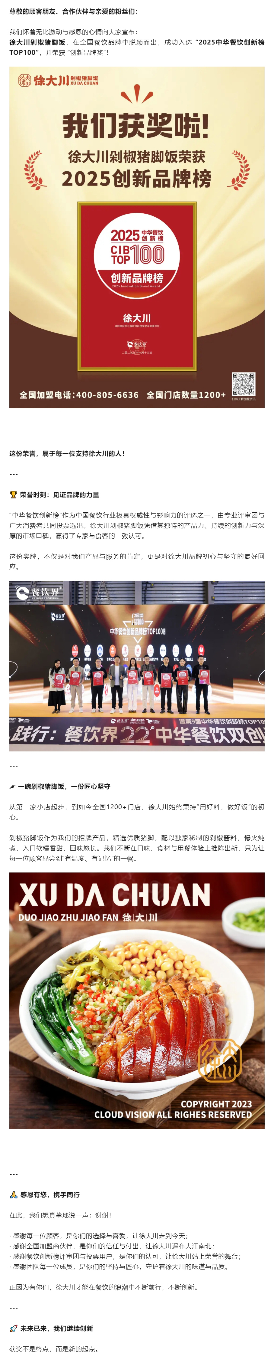 【喜报】徐大川剁椒猪脚饭荣获“2025中华餐饮创新榜TOP100”!感恩一路有您!